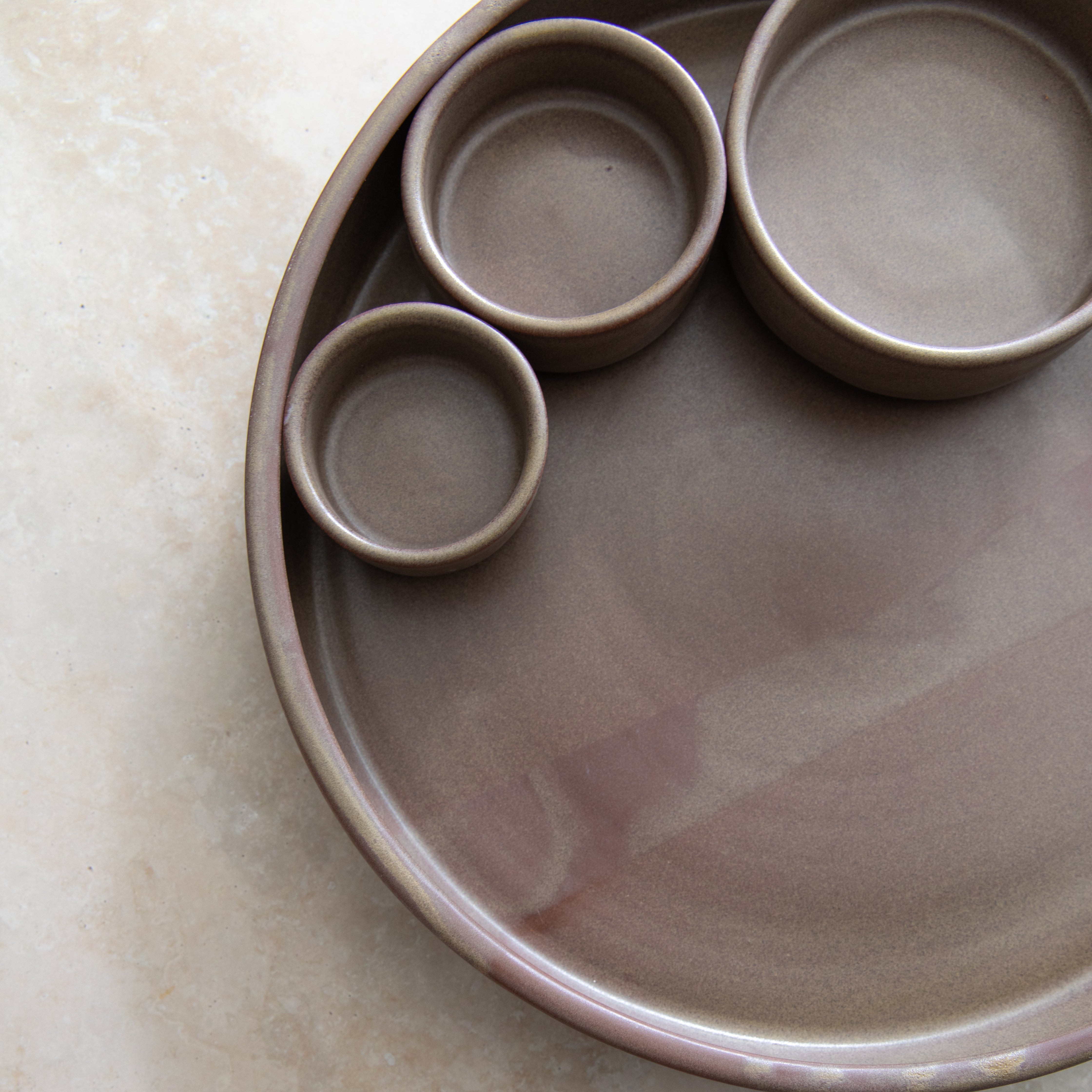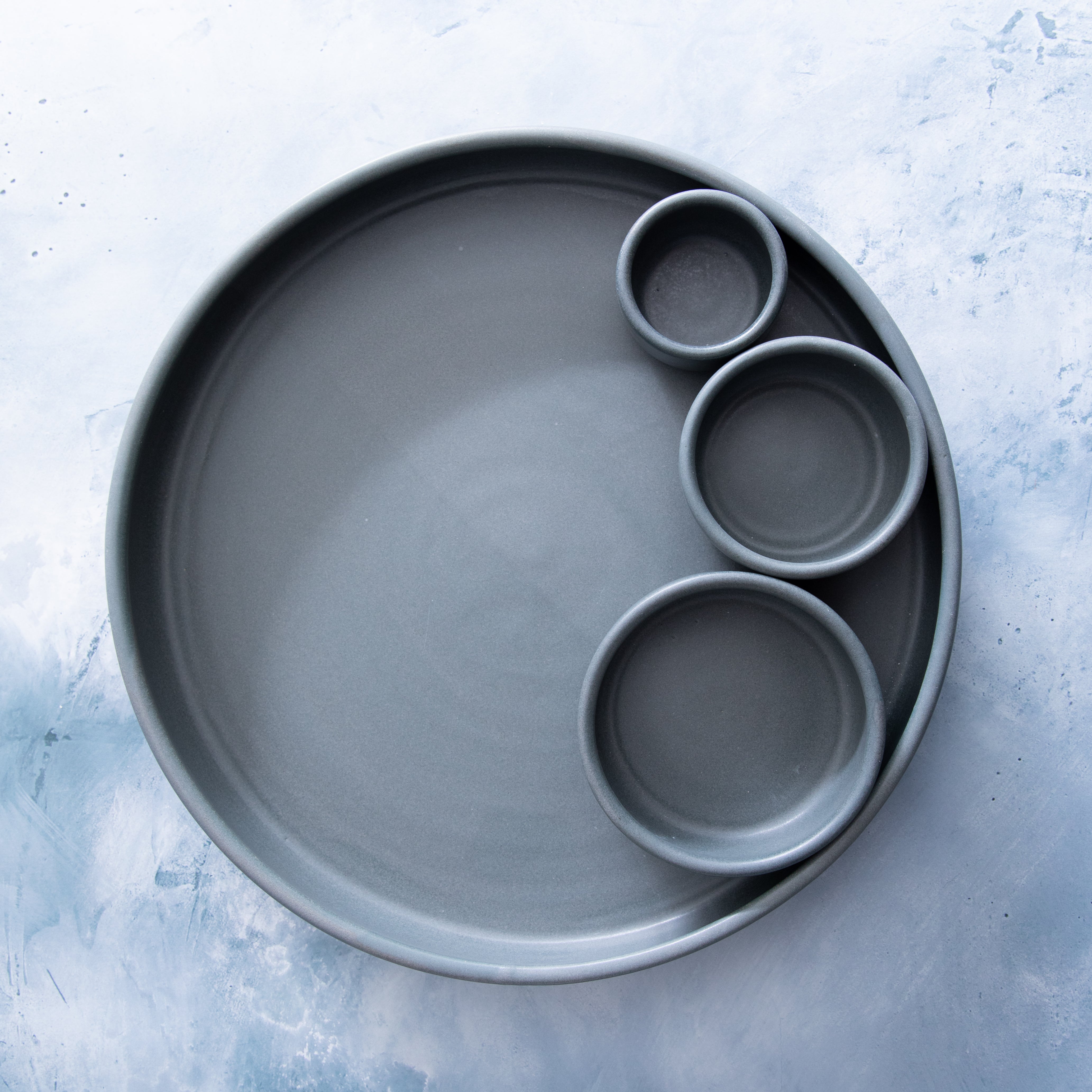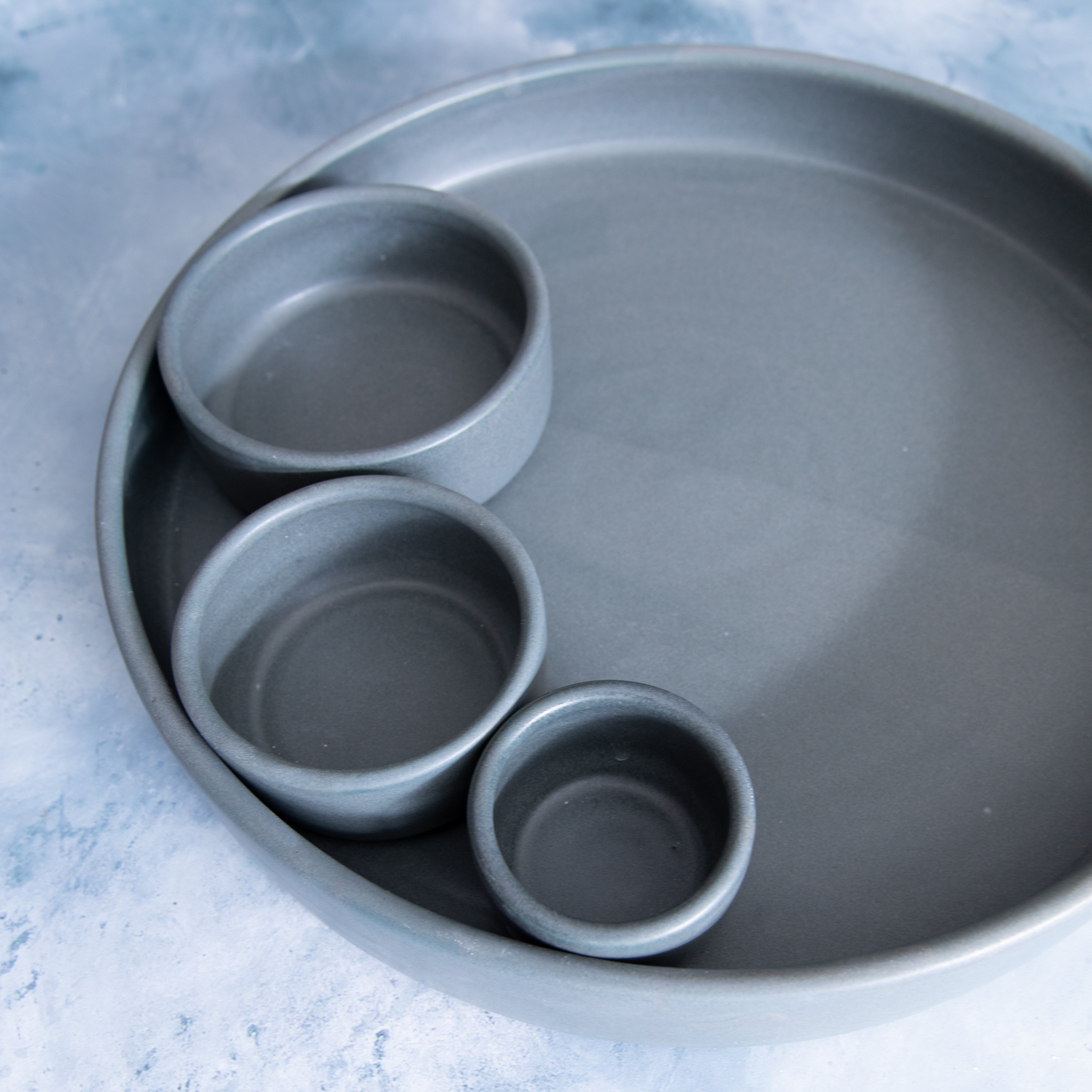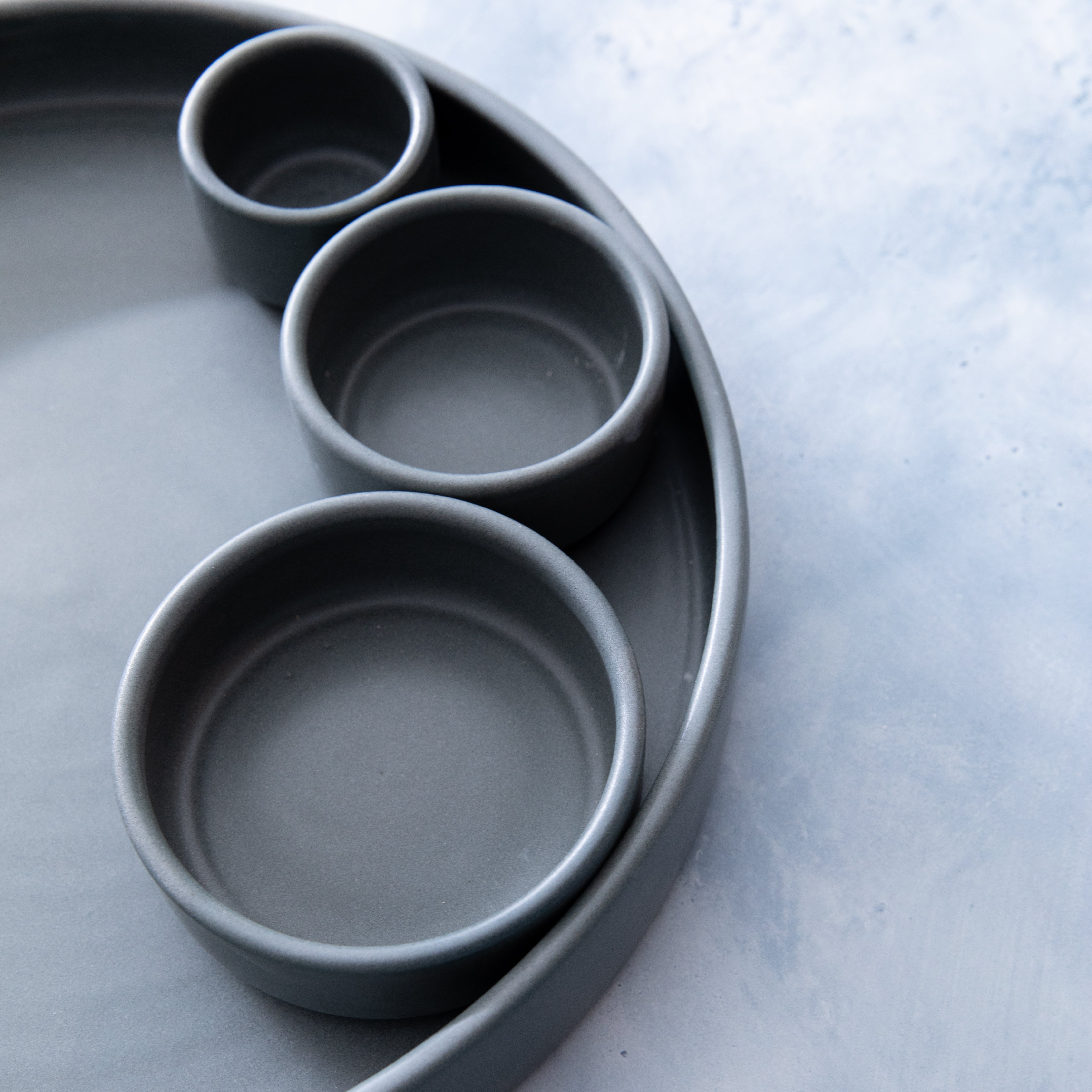The Gathering Board is a four-piece set including a large serving board and 3 ramekins: 1 large, 1 medium, and 1 small.