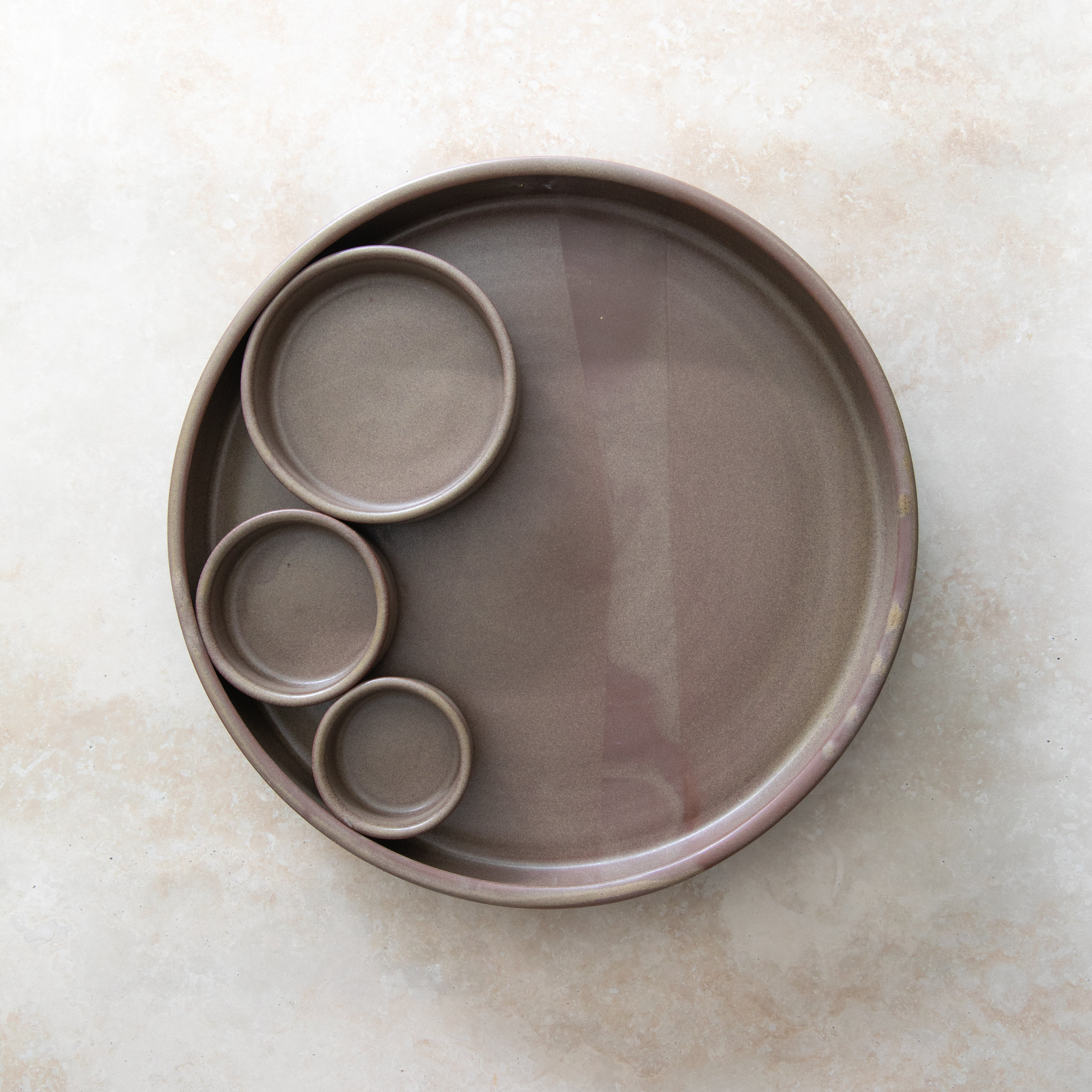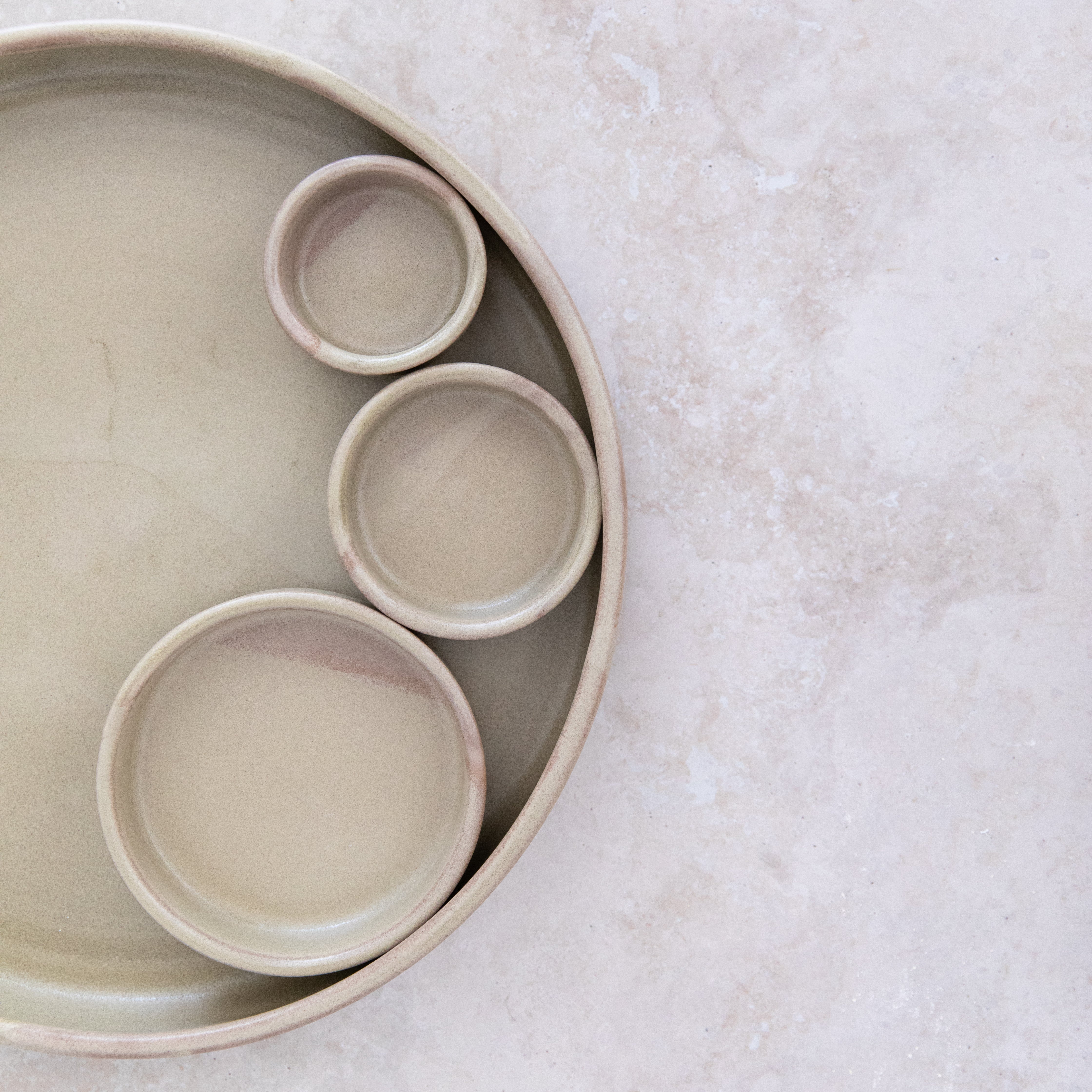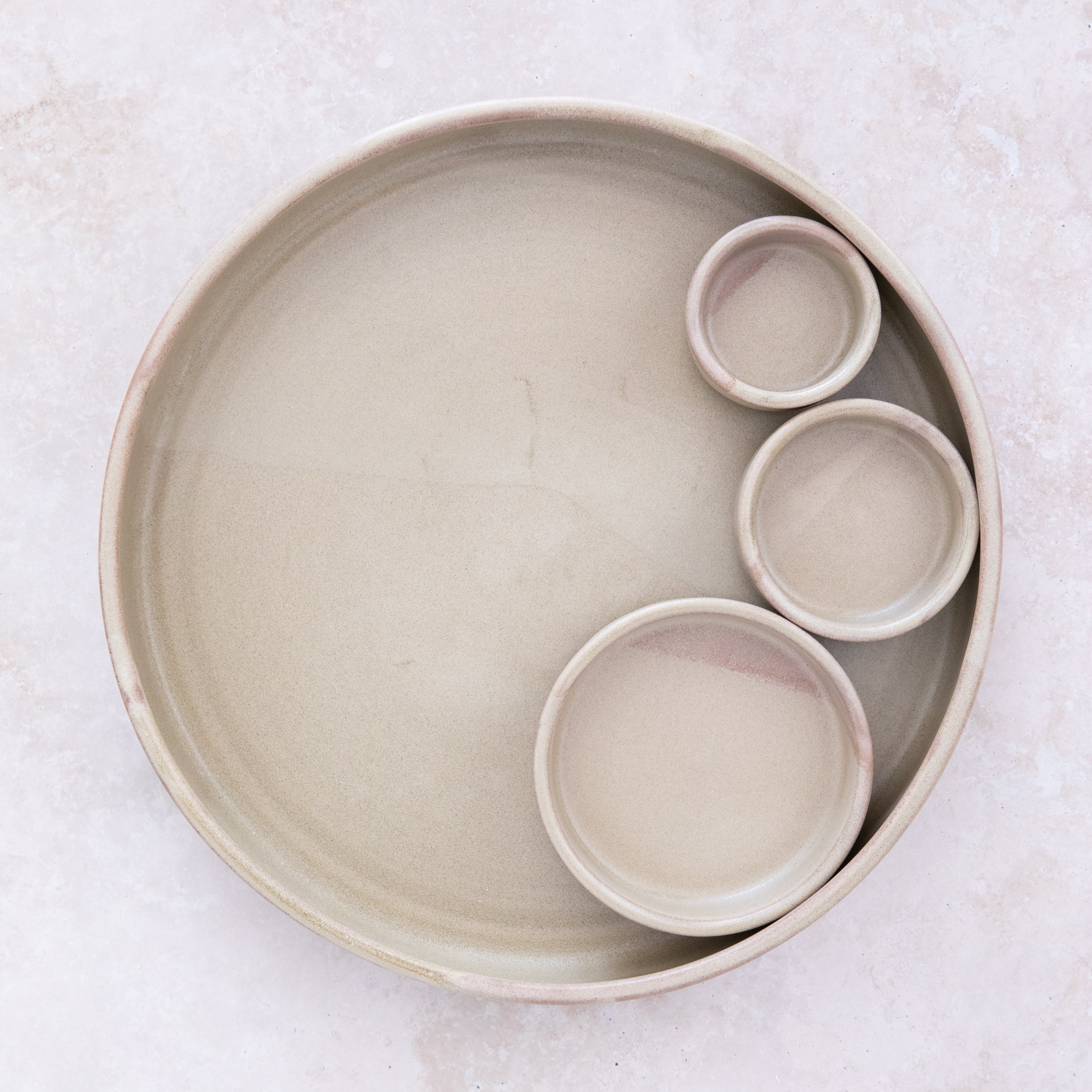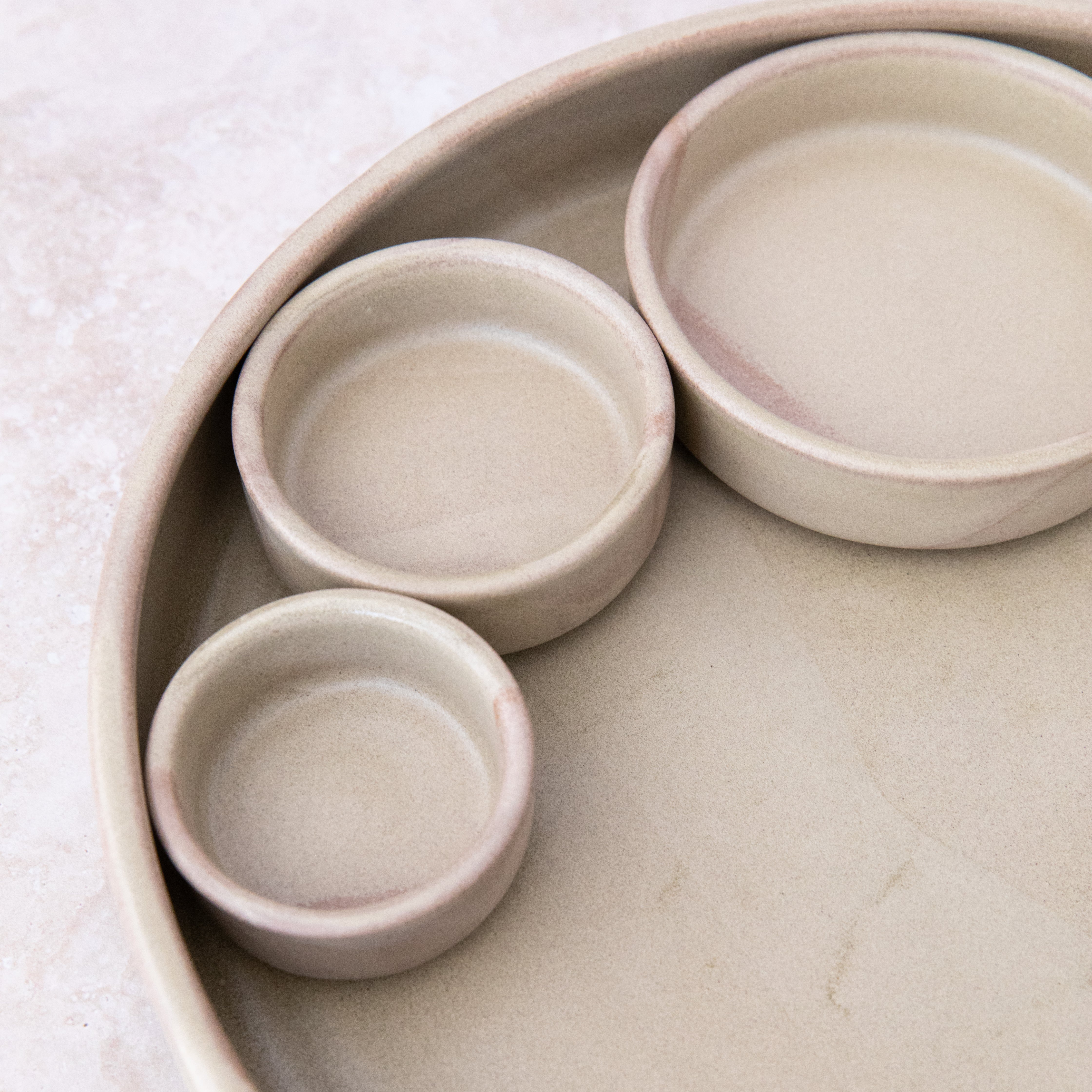 The Gathering Board is a four-piece set including a large serving board and 3 ramekins: 1 large, 1 medium, and 1 small.
