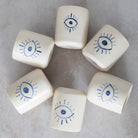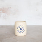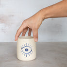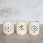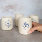 A cup for protection. Each is unique with a hand-painted Evil Eye in our Greco Blue wash.